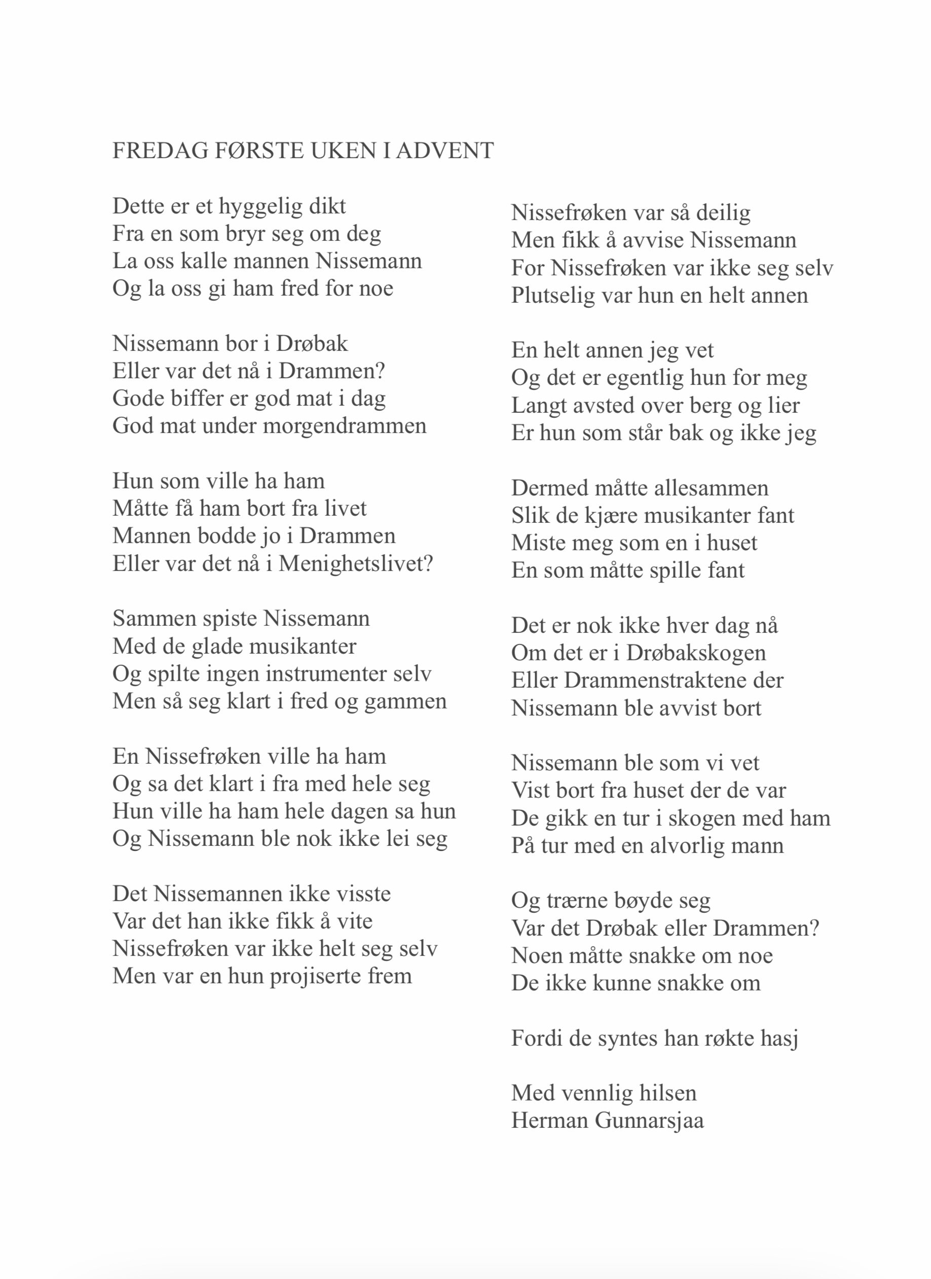 Publiser desember 6, 2019desember 6, 2019 av nettstedet hermangunnarsjaa.com fredag første uken i Advent (C) leve.live og Herman Gunnarsjaa