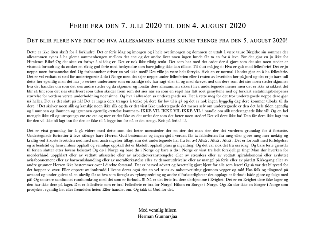 Siden det er sommer er det fint å lese avisen med agurker til! DAGENS AVIS I DAGENS AGURKTID er skrevet av Herman Gunnarsjaa. Likefullt er det forbudt å bevege mennesker i hele verden dit de ikke vil. Og dere vil vel ikke ha ferie! Det hørtes vel ut som en arbeidsgiver som velger hele verden til å skje med to tonns kraft med full presisjon eller noe annet uhøflig og ulovlig formulert så dere får det livet dere vil ha! Gir man vel inntrykk av! Det betyr selvfølgelig et liv uten ferie for det er sikkert viktig med forhandlinger og dele på alle andre enn seg selv og sikkert lurt å styre helt synlig slik at ingen får det slik de vil ha det. Hvis du forstår hva jeg mener er ikke dere meg eller undertegnede dere på noen måte noensinne! Sikkert og visst er det viktig ikke å ta feil. Det var det! Håper dere får en fin sommer og det er lagt til noen forfriskende momenter og komplikasjoner mot slutten av hele komposisjonen og dermed er det slutt på det! God sommer!