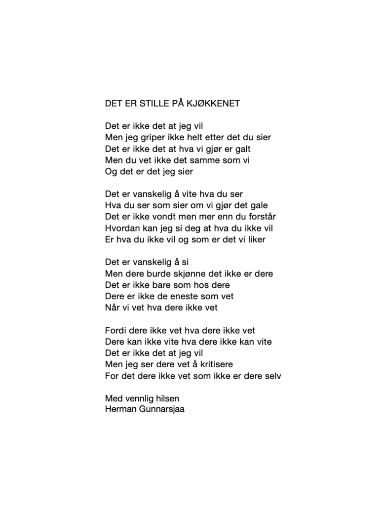 Publiser oktober 14, 2020oktober 14, 2020 av nettstedet hermangunnarsjaa.com det er stille på kjøkkenet (C) leve.live og hermangunnarsjaa.com og Herman Gunnarsjaa