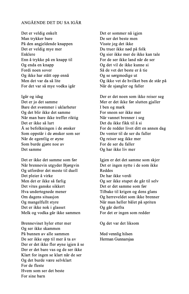 Publiser november 18, 2020november 18, 2020 av nettstedet hermangunnarsjaa.com angående det du sa igår (C) leve.live og hermangunnarsjaa.com og Herman Gunnarsjaa