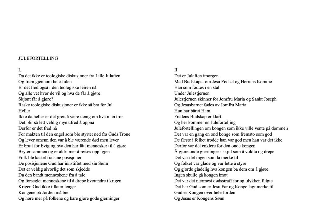 Det viser seg mange ganger hvordan enkelte ikke liker å feire Julaften alene. Koden for det hele er ikke å regne som fantastisk lenger! Det er altfor mye sne andre steder. De ser sikkert etter noe å lete etter gåter med men det nytter ikke med gåter når en aldri får fred! Det er bare rot som det blir egentlig både der De befinner Dem og alle andre steder! De må vite hvem De snakker med ser De.