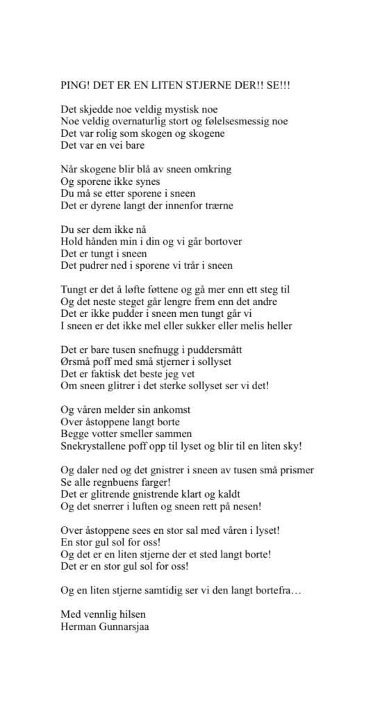 Publiser februar 14, 2022februar 13, 2022 av nettstedet hermangunnarsjaa.com ping! det er en liten stjerne der!! se!!! (C) hermangunnarsjaa.com og Herman Gunnarsjaa