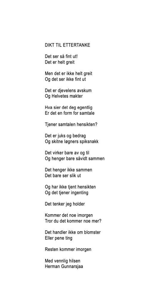 Publiser april 21, 2022april 21, 2022 av nettstedet hermangunnarsjaa.com dikt til ettertanke (C) hermangunnarsjaa.com og Herman Gunnarsjaa