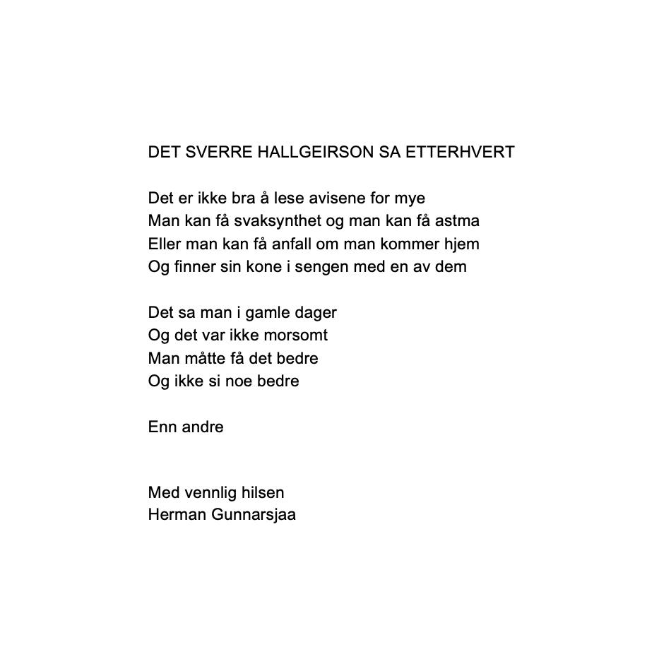 Publiser januar 16, 2023januar 16, 2023 av nettstedet hermangunnarsjaa.com det Sverre Hallgeirson sa etterhvert (C) hermangunnarsjaa.com og Herman Gunnarsjaa