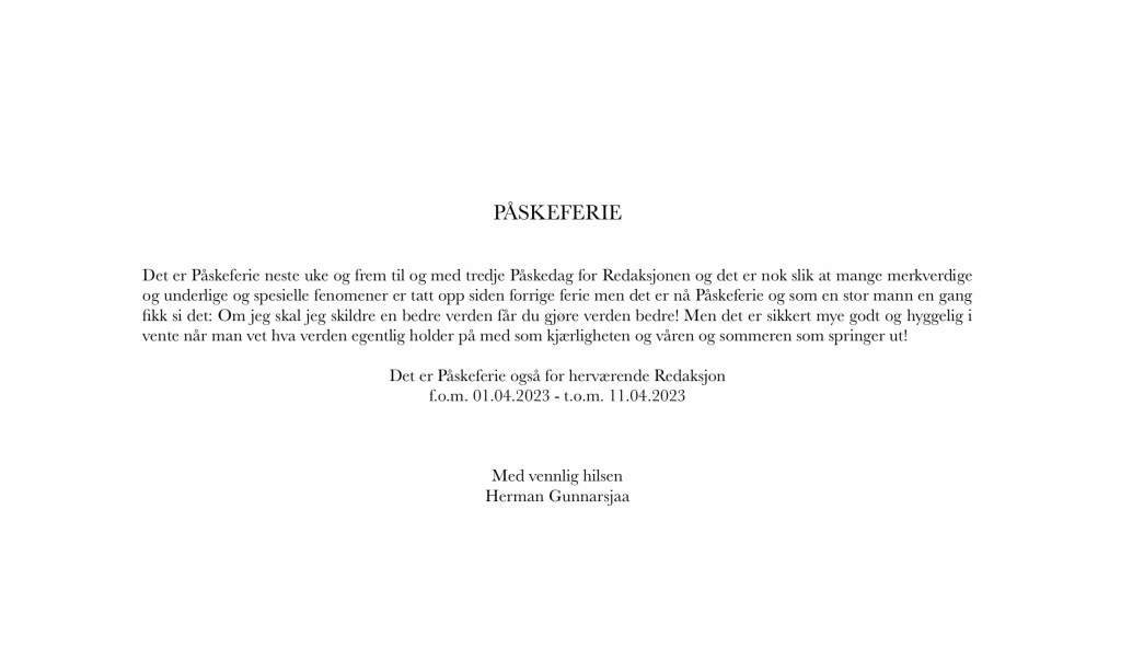 Publiser mars 31, 2023mars 31, 2023 av nettstedet hermangunnarsjaa.com Påskeferie 2023 (C) hermangunnarsjaa.com og Herman Gunnarsjaa