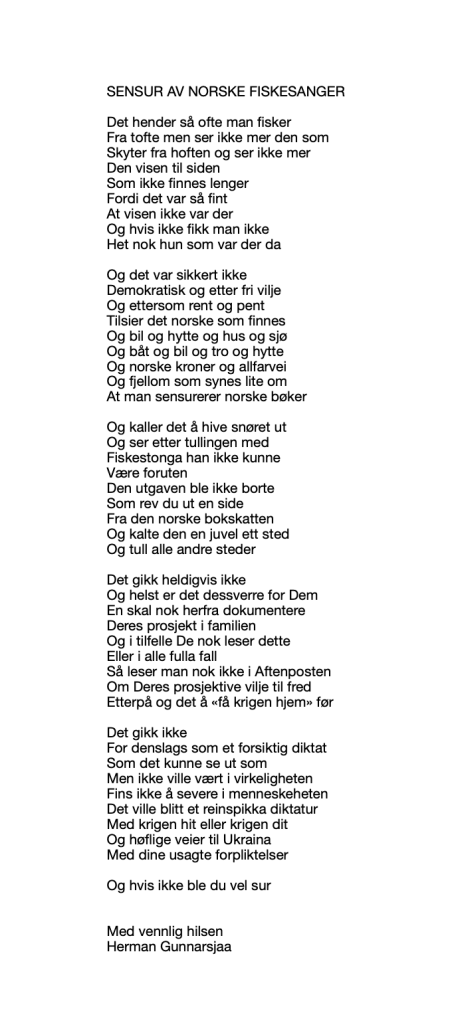 Publiser mars 9, 2023mars 6, 2023 av nettstedet hermangunnarsjaa.com sensur av norske fiskesanger (C) hermangunnarsjaa.com og Herman Gunnarsjaa