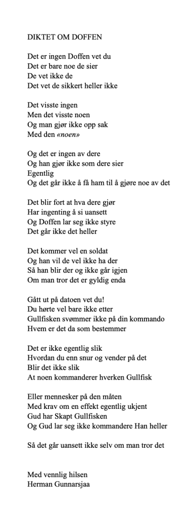 Publiser mars 10, 2023mars 6, 2023 av nettstedet hermangunnarsjaa.com diktet om Doffen (C) hermangunnarsjaa.com og Herman Gunnarsjaa
