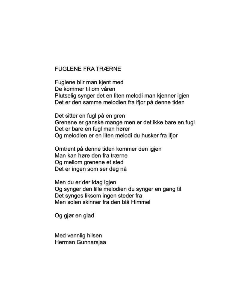 Publiser april 20, 2023april 19, 2023 av nettstedet hermangunnarsjaa.com fuglene fra trærne (C) hermangunnarsjaa.com og Herman Gunnarsjaa