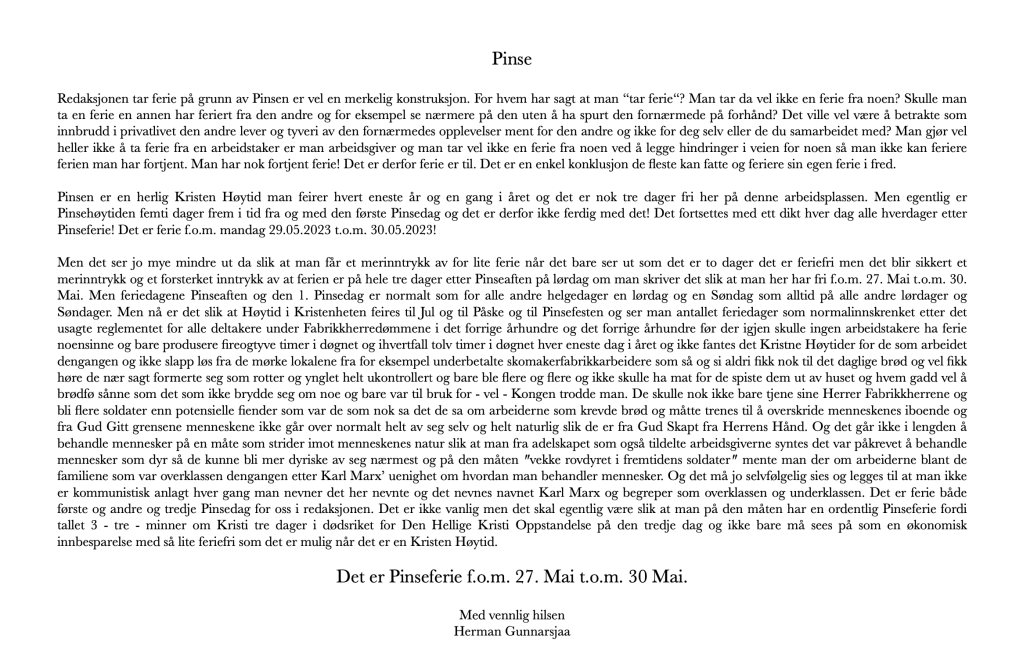 Publiser mai 26, 2023 av nettstedet hermangunnarsjaa.com Pinseferie! (C) hermangunnarsjaa.com og Herman Gunnarsjaa