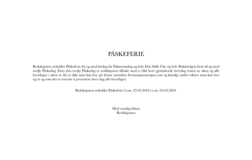 Publiser mars 25, 2024april 3, 2024 av nettstedet hermangunnarsjaa.com Påskeferie 2024 (C) hermangunnarsjaa.com og Herman Gunnarsjaa