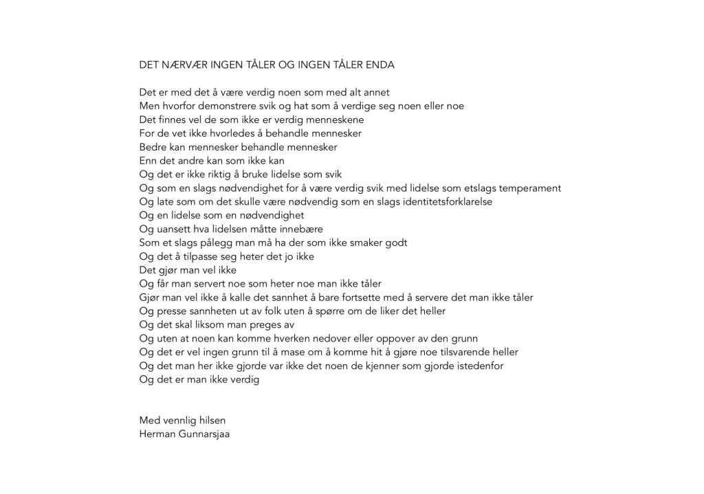 Publiser juni 12, 2024juni 12, 2024 av nettstedet hermangunnarsjaa.com det nærvær ingen tåler og ingen tåler enda (C) hermangunnarsjaa.com og Herman Gunnarsjaa
