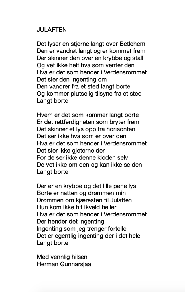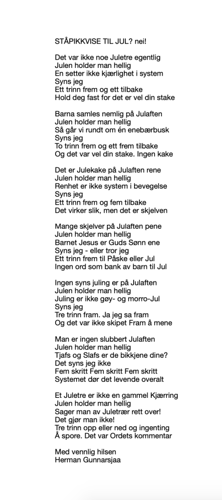 Publiser november 7, 2019 av nettstedet hermangunnarsjaa.com ståpikkvise til Jul? nei! (C) leve.live og Herman Gunnarsjaa