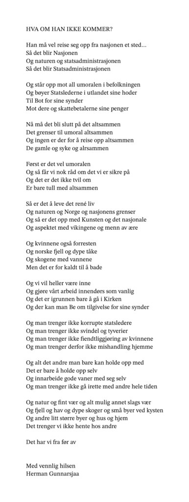 Publiser november 12, 2024november 18, 2024 av nettstedet hermangunnarsjaa.com hva om han ikke kommer? (C) hermangunnarsjaa.com og Herman Gunnarsjaa