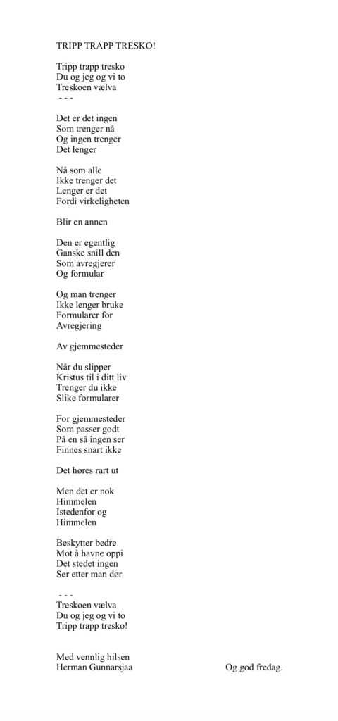 Publiser september 27, 2024 av nettstedet hermangunnarsjaa.com tripp trapp tresko! (C) hermangunnarsjaa.com og Herman Gunnarsjaa