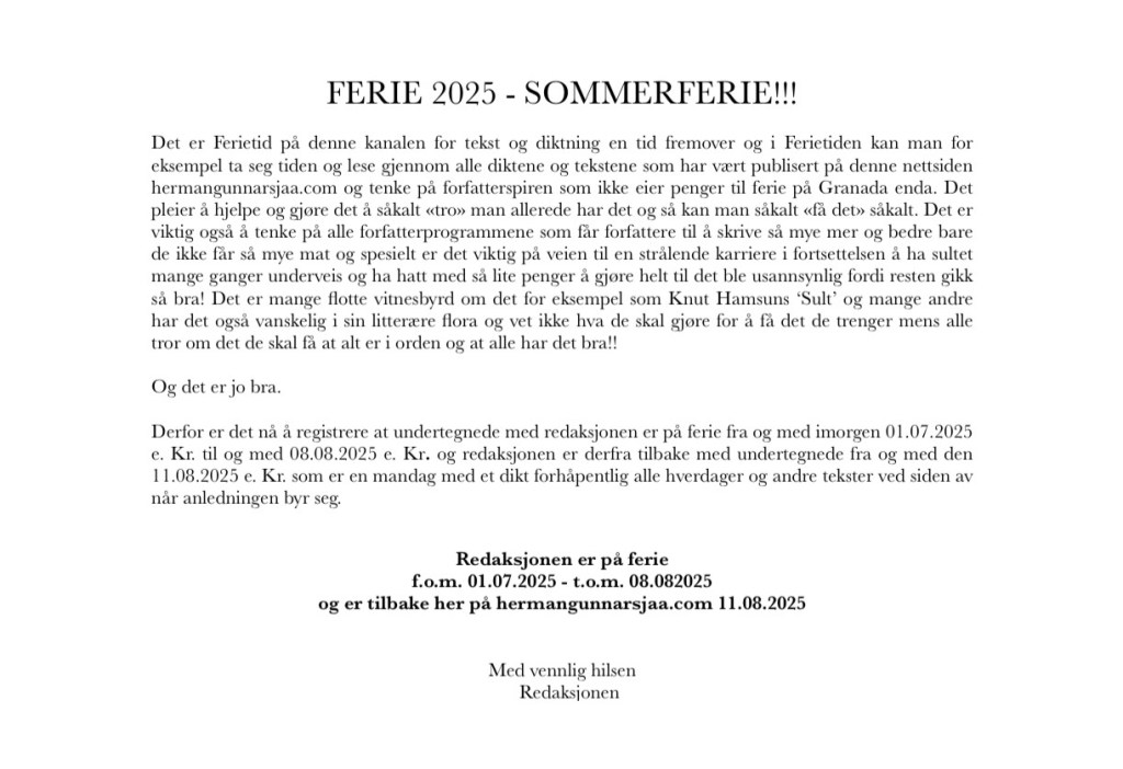 Publiser juni 30, 2025 av nettstedet hermangunnarsjaa.com Sommerferie 2025 (C) hermangunnarsjaa.com og Herman Gunnarsjaa